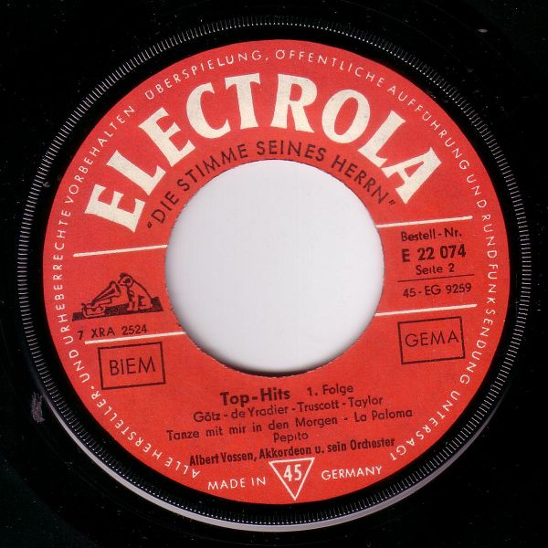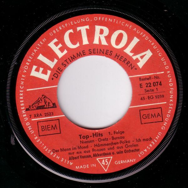 03 62….E 22 074....Albert Vossen, Akkordeon u. sein Orchester..Top-Hits 1. Folge Der Mann im Mond – Hämmerchen-Polka - Ich mach mir nix aus Prinzen und aus Grafen/Tanze mit mir in den Morgen - La Paloma Pepito *)