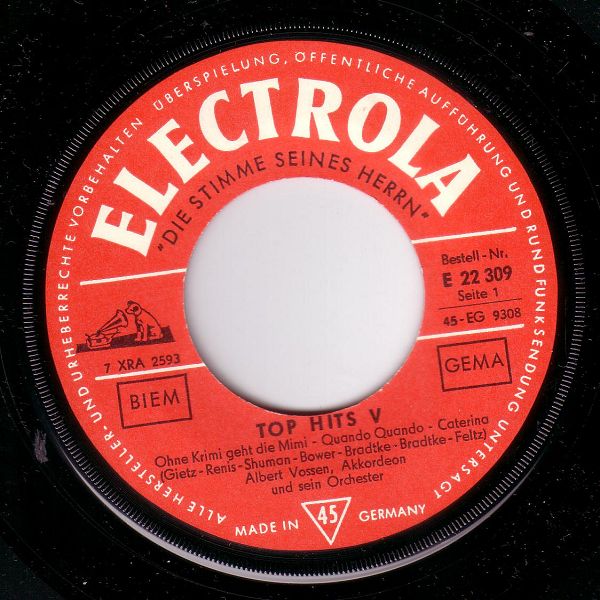 12 62....E 22 309....Albert Vossen, Akkordeon und sein Orchester..TOP HITS V Ohne Krimi geht die Mimi - Quando Quando - Caterina/Sweety - Sei doch mein Talisman - Norman