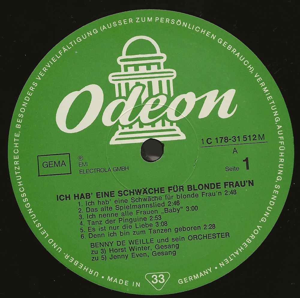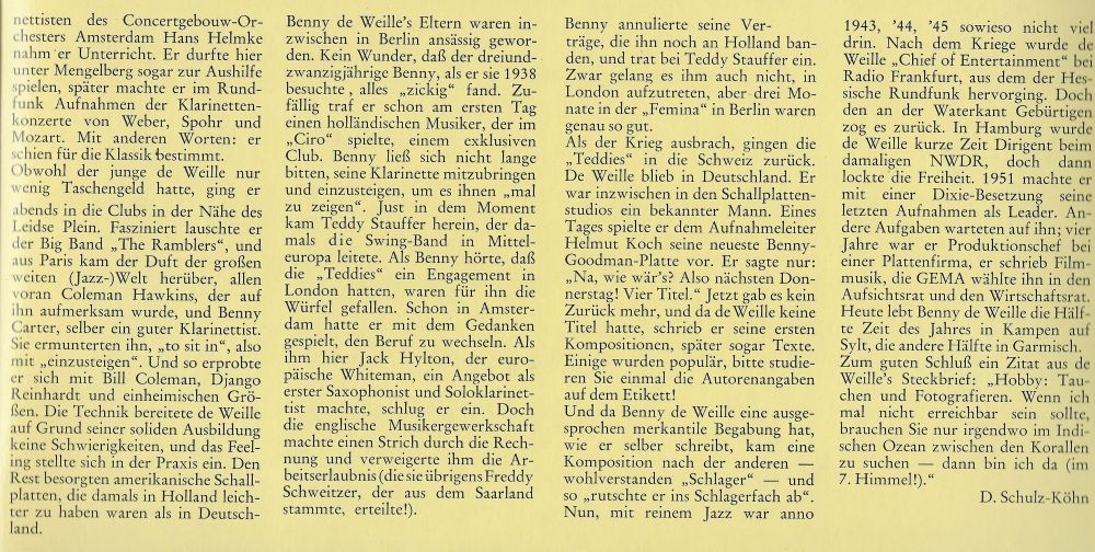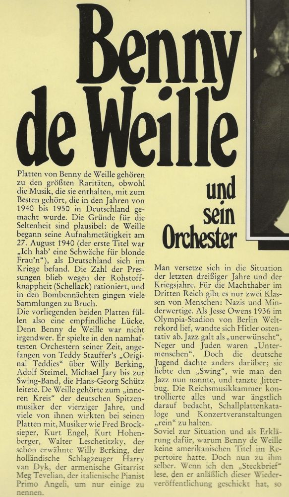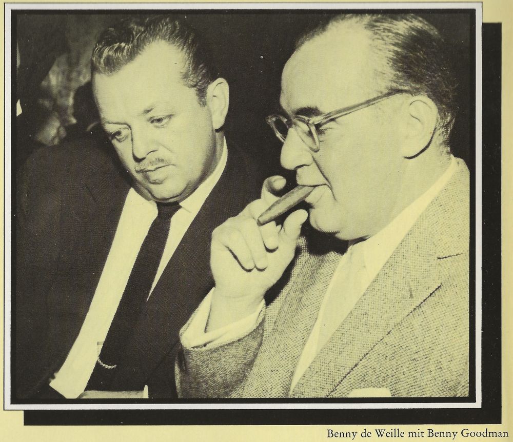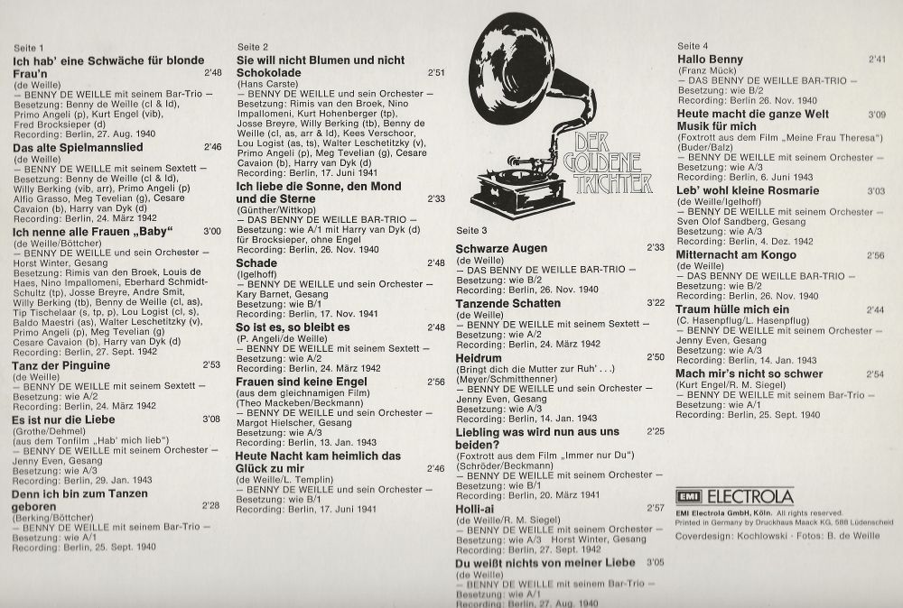März 1942 in Berlin BENNY de WEILLE-SEXTETT (BENNY de WEILLE-cl, ld, WILLY BERKING-tb, PRIMO ANGELI-p, ALFIO GRASSO-g, MEG TEVELIAN-g, CESARE CAVAION-b, HARRY van DYK-d, Schallplatten auf Odeon-4 Aufnahmen u.a. "Tanz Der Pinguine"),