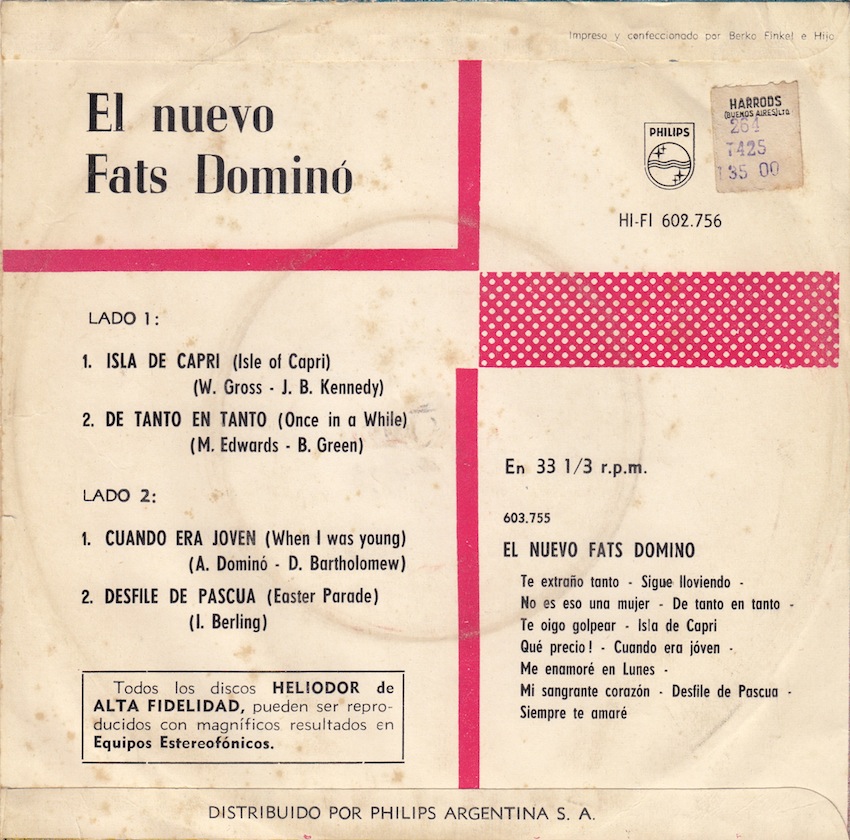 Fats Domino gab es in Argentinien und Uruguay auf Heliodor. Imperial wurde durch die Philips vertrieben. Insgesamt gibt es 2 EP's, 2 LP's und diverse Sampler.