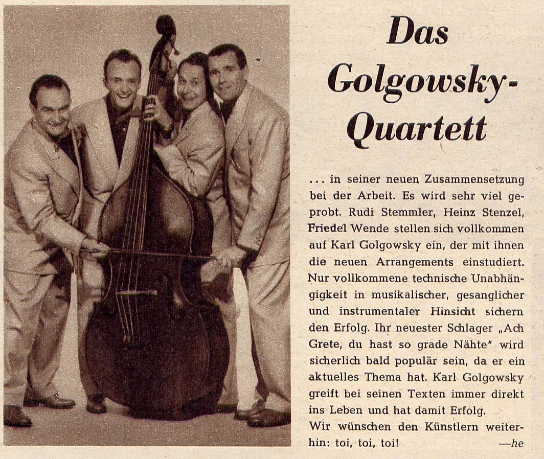 auf das Betreiben von WILL GLAHÉ wird 1949 das GOLGOWSKY-QUARTETT gegründet, um den GLAHÉ-Klangkörper auf der Bühne u. der Schallplatte vokalistisch zu begleiten, Zusammenarbeit bis Ende der 50er Jahre,