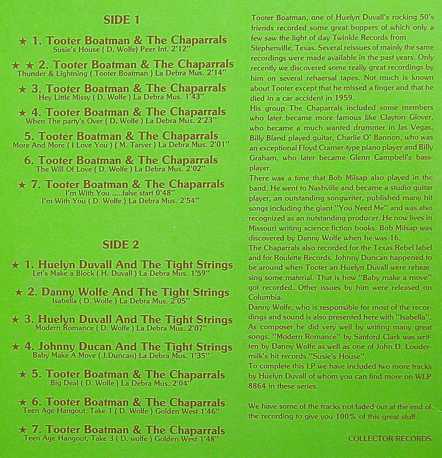 Der Rockabilly-Sänger und Gitarrist Tooter Boatman wurde am 30. Mai 1936 in Mineral Wells, Texas, als William McCon Boatman, Jr., geboren und verstarb am 1. August 1964 in Clear Lake, Louisiana, an den Folgen eines Autounfalles. Bei der Formation The Chaparrals war er der Vokalist und spielte die Gitarre.
