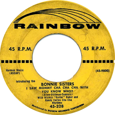 12 55….45-328…Sung by BONNIE SISTERS WITH ORCH. ..I Saw Mommy Cha Cha Cha With You Know Who? (45-9800)/Cry Baby (45-9801)