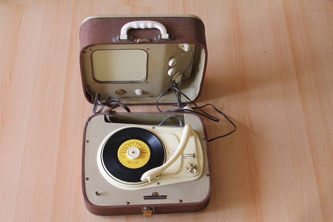 Einen voll Funktionstüchtigen “Perpetuum Ebener” Kofferschallplattenspieler aus den 50´s mit 4.Geschwindigkeiten 16,33,45 und 78.