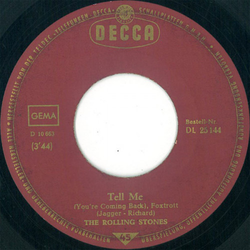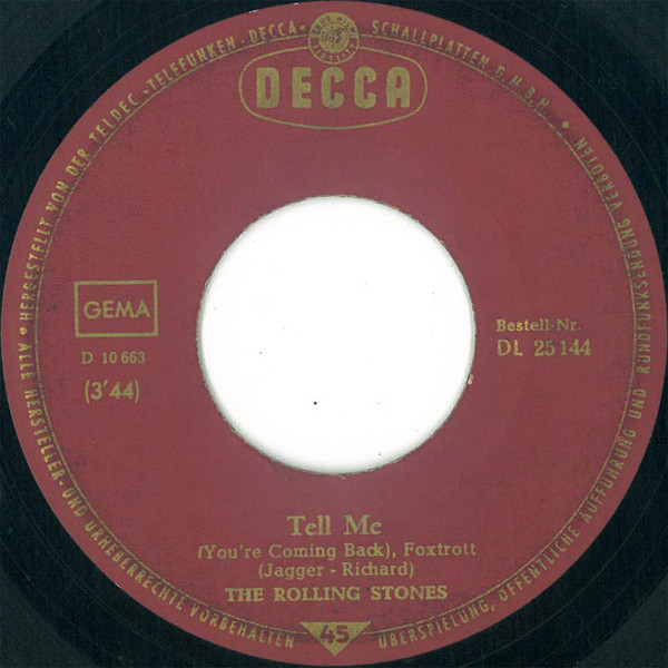 Matrix B: D 10 663 Composer A: B. & S. Womack Composer B: Jagger - Richard Original Label A: Decca F.11934 Original Label B: Decca LK. 4605 1. Pressung: Five Head Cover ohne Diskografie nur mit Text Vollgold Decca-Emblem 2. Pressung: Five Head Cover mit Diskografie, Text und schwarzem Strich unter "The Rolling Stones" Vollgold Decca-Emblem 3. Pressung: Five Head Cover ohne Diskografie nur mit Text normales Decca-Eblem 4. Pressung: Five Head Cover mit Diskografie, Text und schwarzem Strich unter "The Rolling Stones" normales Decca-Emblem 5. Pressung: Weisser Balken-Cover mit kurzer Diskografie normales Decca-Emblem 6. Pressung: Weisser Balken-Cover mit langer Diskografie normales Decca-Emblem Eventuell gibt es das "Weisse Balken-Cover" auch noch mit Diskografie, Text und dem schwarzem Strich unter "The Rolling Stones"!!! 7. Pressung: London-Nachpressung von 1989 (London 882 148-7) 8. Pressung: London-Nachpressung von 1990 (London 882 148-7) |