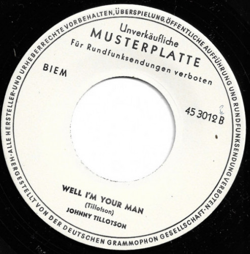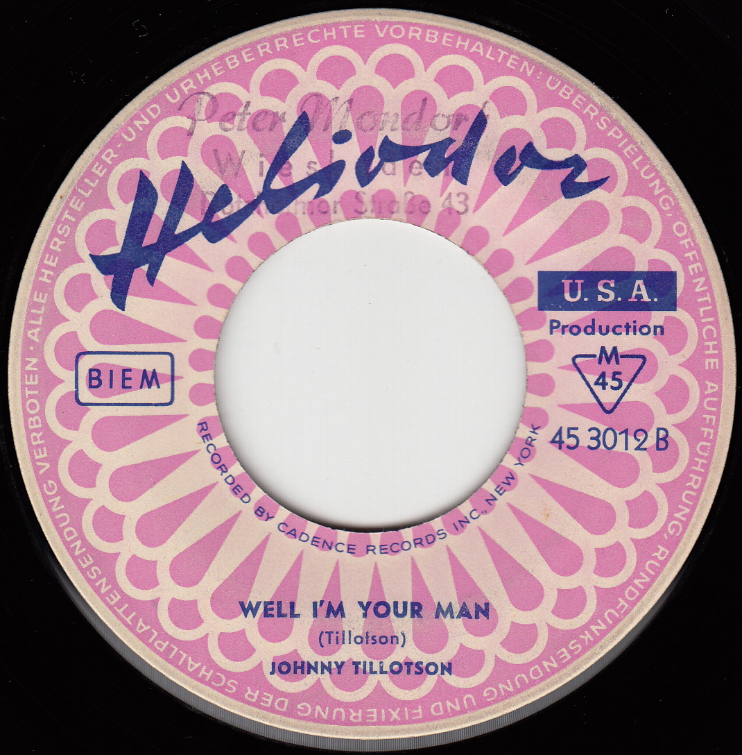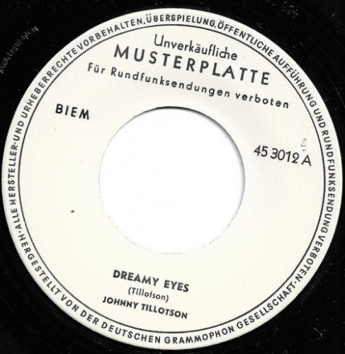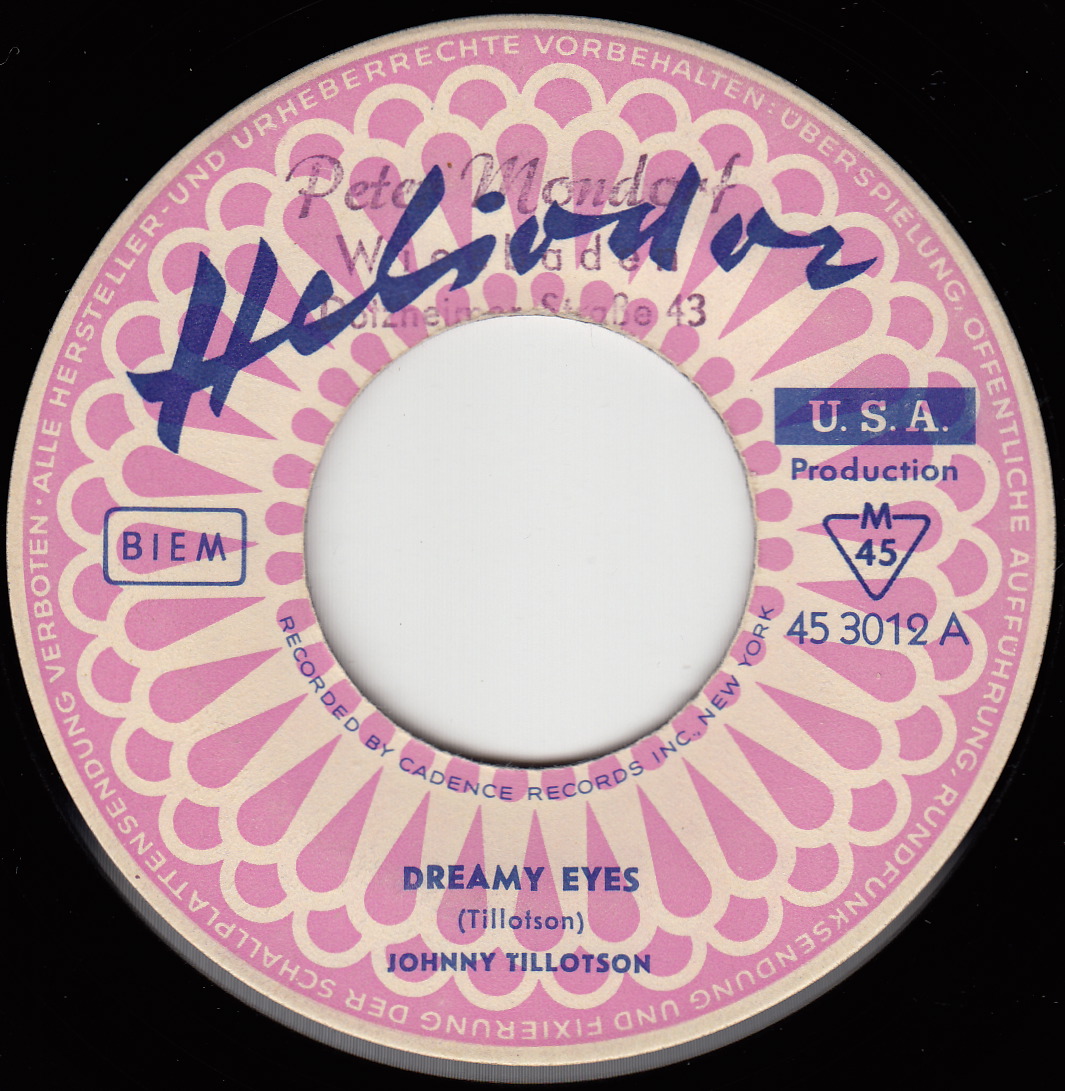 Tillotson, Johnny: Dreamy Eyes / Well I’m Your Man Original-Label: Cadence 1353, deutsche Matritzenherstellung K 8 ( Oktober/1958), Composer von A : “Johnny Tillotson” und B : “ Johnny Tillotson ”, deutsche Platte auf rosa Label, Placierung Hitparade in den USA: „Dreamy Eyes “ 11/58, # 63 pop und “Well I’m Your Man” 10/58, # 87 Note: Johnny wurde am 20.4.1939 in Jacksonville, Florida, geboren und sang schon während seiner Schulzeit auf der Palatka Sr. High School. Dann trat er in der TV-Show von Toby Dowdy auf, was ihm nach Publikumsreaktionen einen 3-Jahresvertrag in der Show einbrachte. Als diese eingestellt wurde, hatte er seine eigene TV-Show und begann mit dem Songwriting. 1957 war er unter den Gewinnern eines Contests und trat dann im WSM-Radio in Nashville auf. Publisherin Lee Rosenberg war begeistert und brachte ein Songdemo zu Archie Bleyer, der zugriff. Johnny studierte bis 1959 an der Universität in Florida Journalismus und Kommunikation, war aber zu diesem Zeitpunkt bereits ein Schallplattenstar. Nach seinem Debut mit „Dreamy Eyes“ und 18 weiteren Charts-Hits wechselte er 1963 von Cadence zu MGM, wo bis Oktober 1965 insgesamt 9 weitere Hits wie „Heartaches By The Number“ folgten. Sein größter Erfolg wurde im Oktober 1961 der # 1-Hit „Poetry In Motion“ (siehe 45 3086), dem im Mai 1962 der # 3-Hit „It Keeps Right On A-Hurtin ́“ (siehe 45 3124) folgte. Text: Dieter Moll |