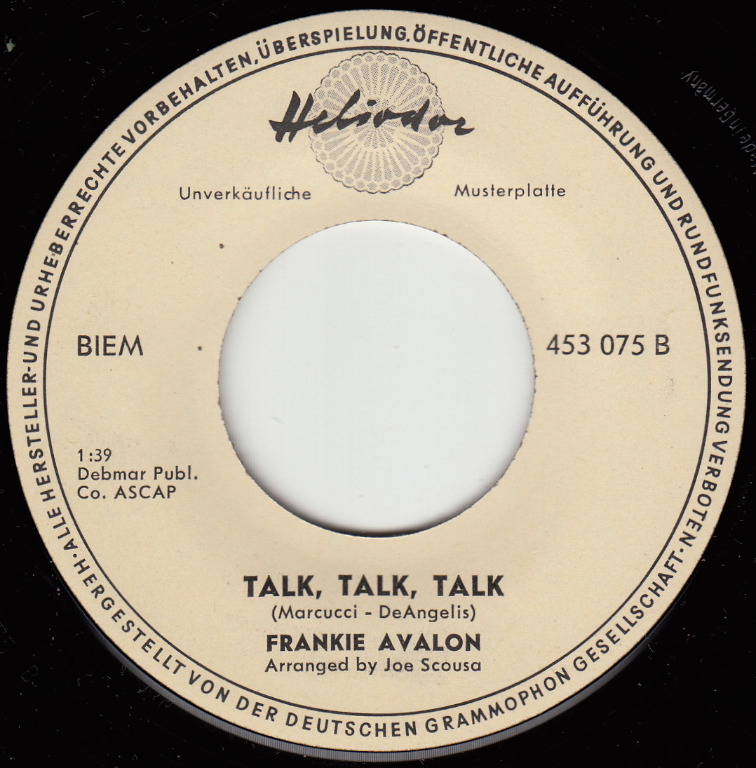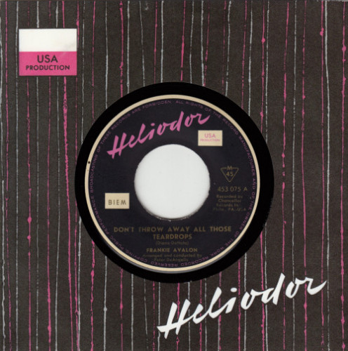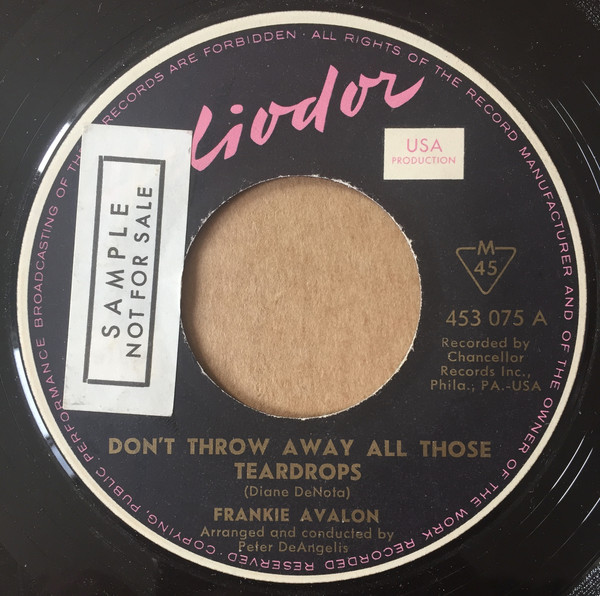 Frankie Avalon: Don’t Throw Away All Those Teardrops / Talk, Talk, Talk Original-Label: Chancellor 1048 (1960), deutsche Matritzenherstellung D 0 ( April/1960), Composer von A : “Diane DeNota” und B : “ Marcucci – Peter de Angelis ”, deutsche Platte auf schwarzen Label, Placierung Hitparade in den USA: „Don ́t Throw Away All Those Teardrops“ # 22 pop (3/1960) Text: Dieter Moll |