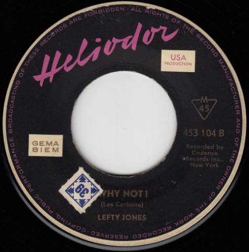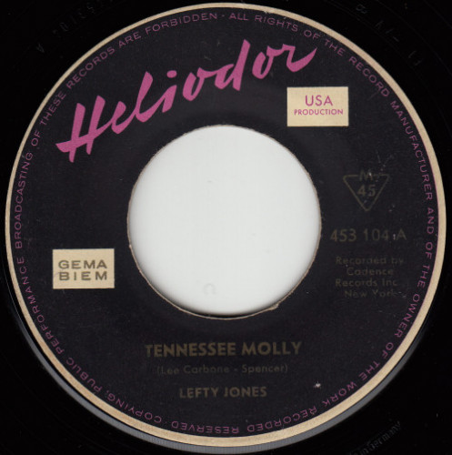 Lefty Jones: Tennessee Molly / Why Not Original-Label: Cadence 1395, deutsche Matritzenherstellung F 1 ( Juni/1961), Composer von A : “ Lee Carbone - Spencer ” und B : “ Lee Carbone ”, deutsche Platte auf schwarzem Label, Placierung Hitparade in den USA: ?? Text: Dieter Moll |