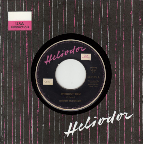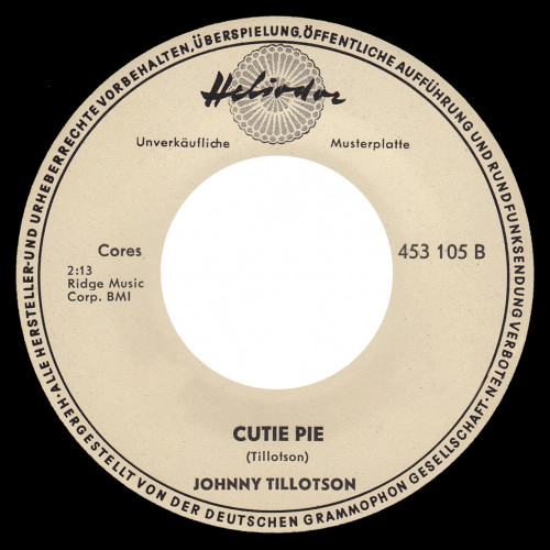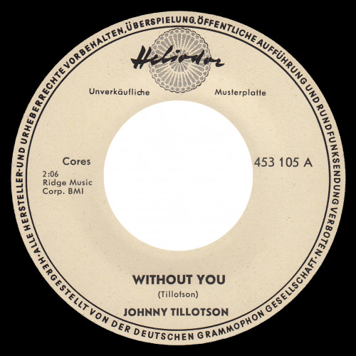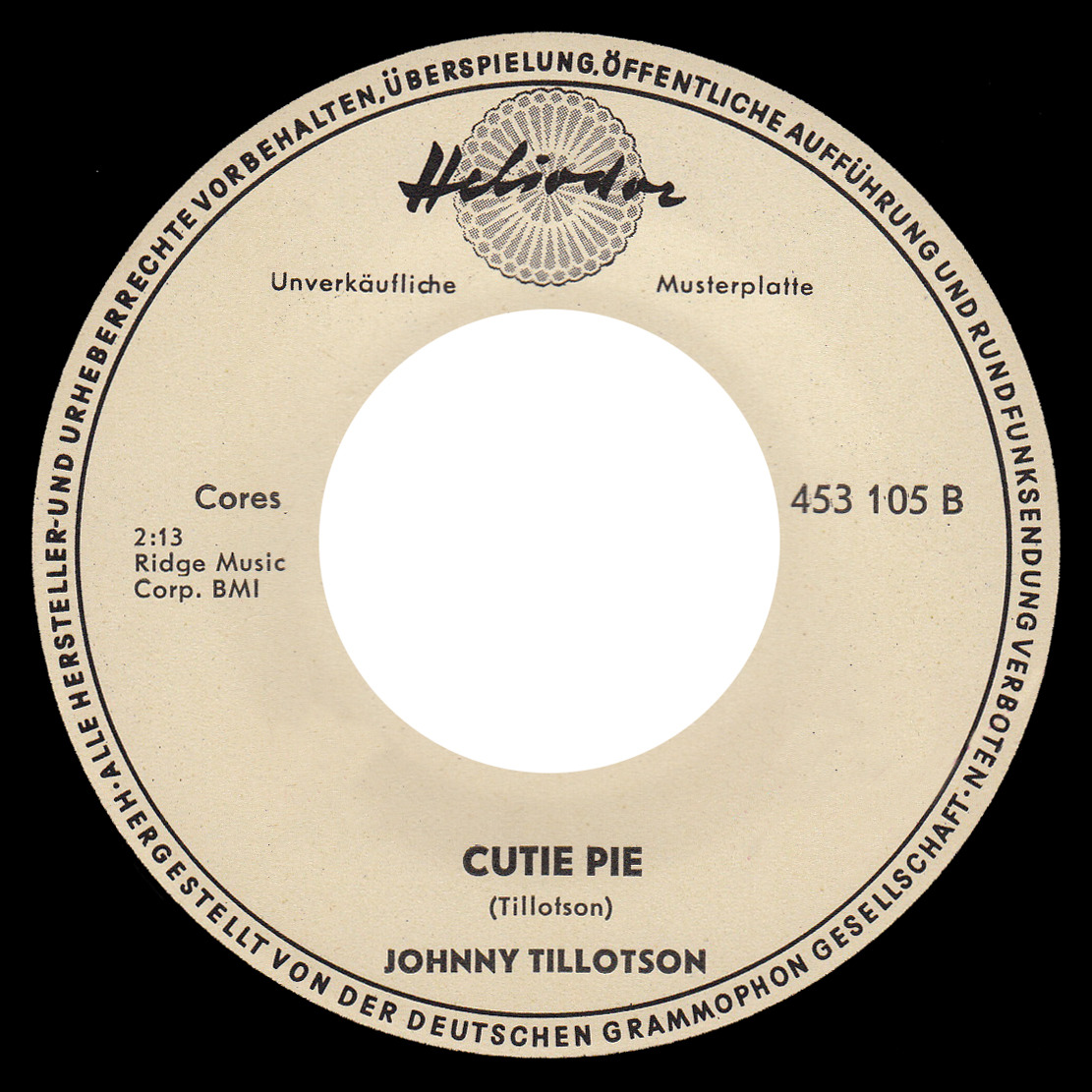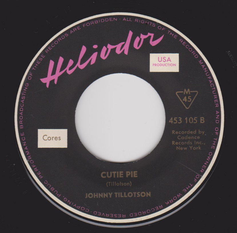 Johnny Tillotson: Without You / Cutie Pie Original-Label: Cadence 1404, deutsche Matritzenherstellung G 1 ( Juli/1961), Composer von A : “ Johnny Tillotson ” und B : “Johnny Tillotson”, deutsche Platte auf schwarzem Label, Placierung Hitparade in den USA: „Without You”, 8-61, # 7 pop Text: Dieter Moll |