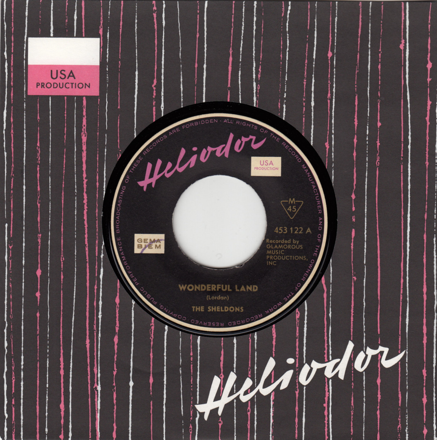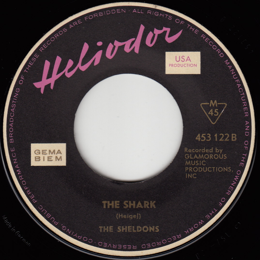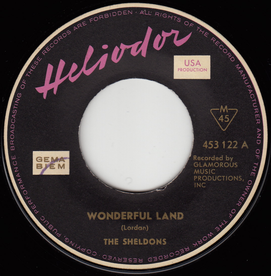Sheldons: Wonderful Land / The Shark Original-Label: Glamorous Music, New York City ???, deutsche Matritzenherstellung D 2 ( April/1962), Composer von A : “ Jerry Lordan ” und B : “Heigel”, deutsche Platte auf schwarzem Label, Placierung Hitparade in den USA: ?? Notes: Die Originalversion der Sheldons von “Wonderful Land” hatte die Matrix-Nummer “PHW 24582” und “The Shark” die Nummer “PHW 24583”. Mit Glamorous Music stand Produzent, Arrangeur, Musiker und Komponist Klaus Ogerman in geschäftlicher Beziehung. „The Shark“ erschien in den USA 1962 mit der Komponistenangabe „G. Heigel“. Drei Jahre später, 1965, spielten die Shadows eine neue Variante des Titels als „Stingray“ mit der Komponistenangabe „Klaus Ogerman“ ein. Die UK-Single der Shadows kletterte dort bis auf Platz 19. UK: Columbia DB 7588 (Rückseite „Alice In Sunderland“); Neuseeland: Columbia DNZ 10416 (gleiche B-Seite). Text: Dieter Moll |