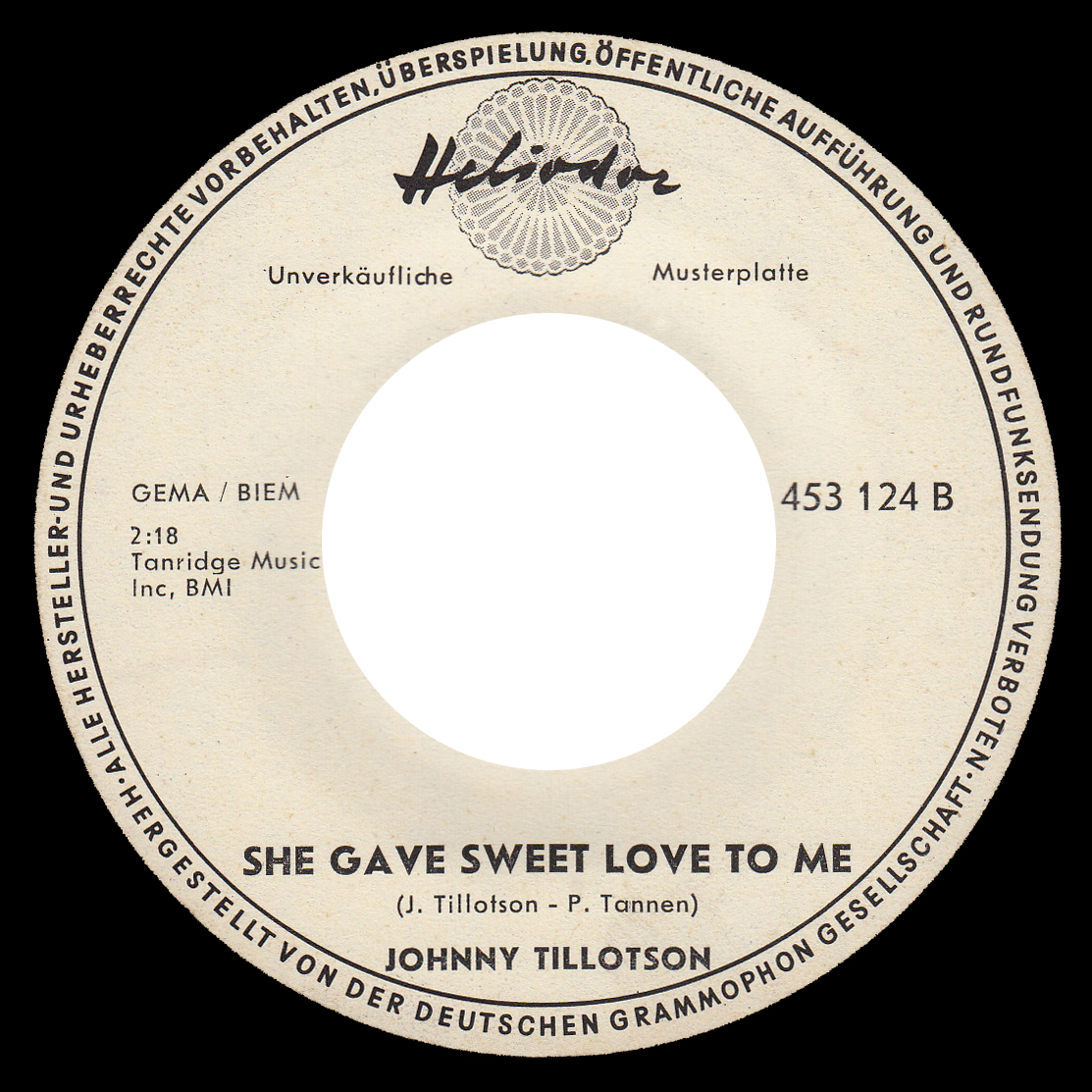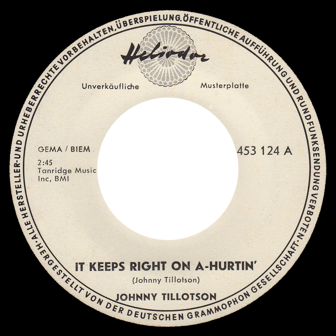 Johnny Tillotson: It Keeps Right On A-Hurtin / She Gave Sweet Love To Me Original-Label: Cadence 1418, deutsche Matritzenherstellung F 2 ( Mai/1962), Bildcover, Composer von A : “ Johnny Tillotson ” und B : “Johnny Tillotson – P. Tannen”, deutsche Platte auf schwarzem Label, Placierung Hitparade in den USA: „It Keeps Right On A-Hurtin” , 5-62, # 3 pop, # 4 country, # 6 r&b Text: Dieter Moll |