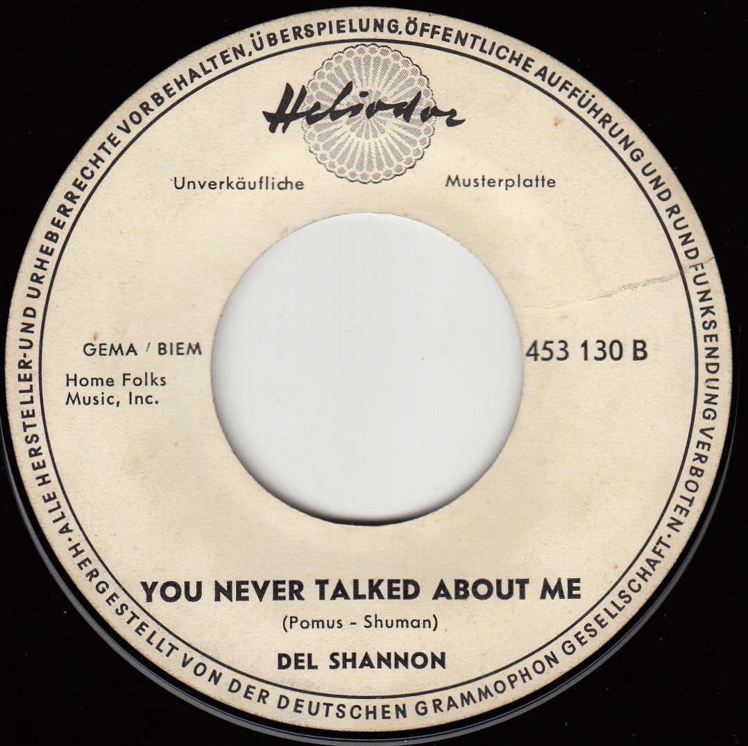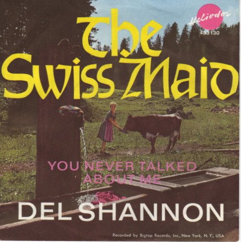 Del Shannon: The Swiss Maid / You Never Talked About Me Original-Label: Big Top 3117 (1962), deutsche Matritzenherstellung J 2 ( September/1962), Bildcover, Composer von A : “ Miller ” und B : “Doc Pomus – Mort Shuman”, deutsche Platte auf schwarzem Label, Placierung Hitparade in den USA: ?? Text: Dieter Moll |