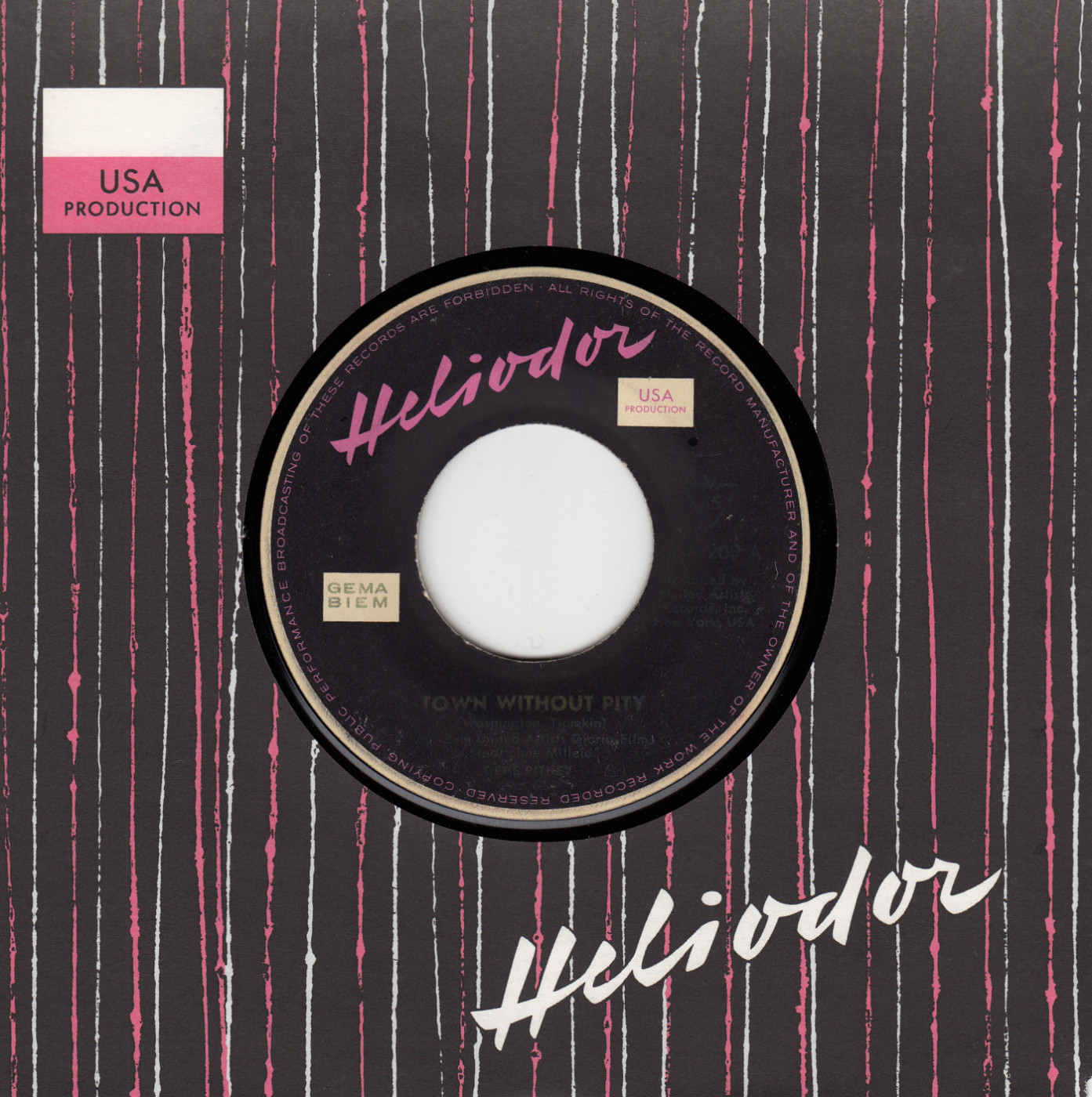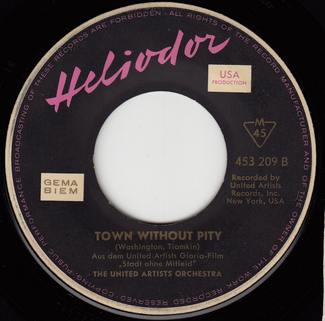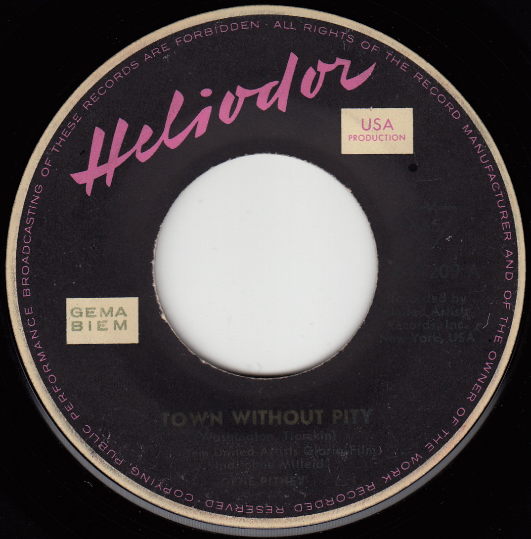 Gene Pitney: Town Without Pity // The United Artists Orchestra: Town Without Pity (Instrumental) Original-Label: United Artists, deutsche Matritzenherstellung D 1 ( April/1961), Composer von A : “ Washington – Dimitri Tiomkin ” und B : “ Washington – Dimitri Tiomkin ”, deutsche Platte auf schwarzem Label, Placierung Hitparade in den USA: ?? Aus dem United Artists Gloria Film „Stadt ohne Mitleid“ Text: Dieter Moll |
