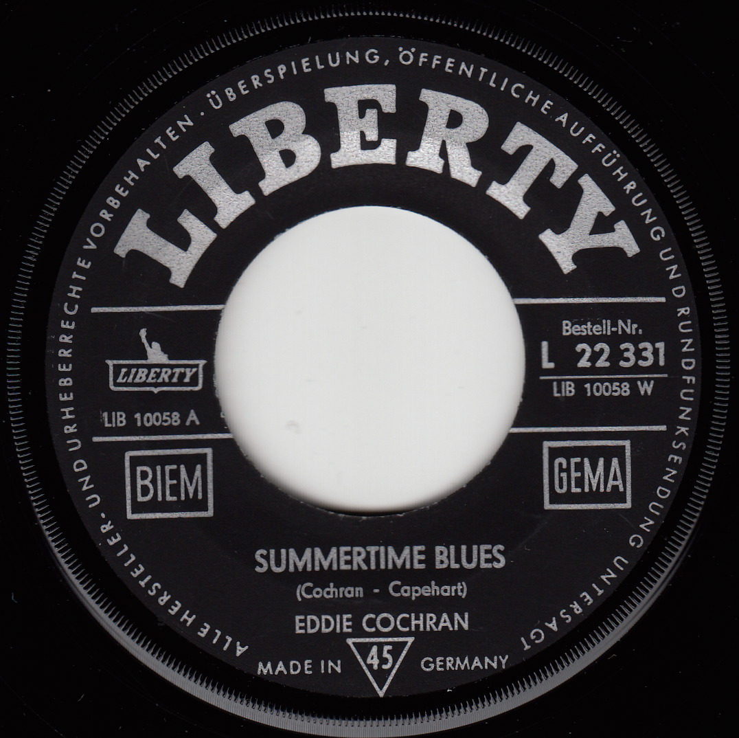 Matrix B: LIB 10 058 W Composer A: Cochran - Capehart Composer B: Wilkin - Walker Summertime Blues Summertime Blues ist ein Rock-’n’-Roll-Song, der 1958 von Eddie Cochran aufgenommen wurde und sich zum Sommerhit und Millionenseller entwickelte. Entstehungsgeschichte Eddie Cochran sollte bei Liberty Records die Rolle von Elvis Presley einnehmen. Der Plattenboss Simon „Si“ Waronker tat sich jedoch schwer mit Rock & Roll-Musik und achtete anfangs streng darauf, dass Cochrans Repertoire nur textlich glatte und aufpolierte Rocksongs enthielt. Im März 1958 entstanden Summertime Blues, Love Again und Lonely im Studio B der Gold Star Studios in Hollywood mit der Besetzung Earl Palmer (Schlagzeug), Conrad „Guybo“ Smith (Bass), Cochran mit seiner „Gretsch 6120“-Gitarre (Riffs zwischen den Texten und ein Blues-Shuffle untermalen den Gesang) und Händeklatschen (wohl Cochrans Freundin Sharon Sheeley). Die Bass-Spur bei Summertime Blues wurde zuerst gelegt, darüber kam dann das sich wiederholende Gitarren-Riff und der echogeladene Gesang. Summertime Blues war erst am Abend vor der Aufnahmesession in Jerry Capeharts Appartement in nur 45 Minuten von Capehart und Cochran geschrieben worden. Er handelt von den Sorgen der Teenager, die am Ende einer Strophe von einer erwachsenen Autorität (als Bass-Stimme von Cochran dargestellt) gemaßregelt werden. Die von Jerry Capehart produzierten Aufnahmen wurden von Waronker kritisch analysiert, und der Labelboss entschied sich für die sentimentale Ballade Love Again als A-Seite. Der 12-taktige Summertime Blues wurde auf die B-Seite verbannt. Als Liberty #55144 erschienen Love Again / Summertime Blues im Juni 1958 auf dem US-amerikanischen Plattenmarkt. Der Titel dauert lediglich eine Minute und 59 Sekunden und endet abrupt. Auf der überwiegenden Mehrzahl der Veröffentlichungen findet sich allerdings die zum Schluss hin ausgeblendete Version. Erfolg der B-Seite Die Radiosender favorisierten sofort die B-Seite mit dem Song über Strapazen, Trübsal und Teenager-Frust im Sommer und bevorzugten ihn beim Airplay. Der Titel verlässt sich auf ein ansteckendes Gitarren-Riff und besteht aus lediglich drei Akkorden. Erst zwei Monate nach Veröffentlichung gelangte er im August 1958 in die amerikanischen Pop-Charts, wo er den achten Platz erreichte. Es sollte Cochrans beste Hitparadenplatzierung bleiben. In Großbritannien erreichte der Song Rang 18 der Charts. In Deutschland erschien die Single erstmals im Juni 1959 im Vertrieb der Teldec auf dem London-Label. Summertime Blues entwickelte sich als konstanter Verkaufstitel, der schließlich Millionenseller-Status erlangte. Capehart hierzu: „Es gab eine Menge Sommerhits, aber keinen über die Schwierigkeiten des Sommers“. Erst nach dem Erfolg des Songs wurde Cochran mehr Freiraum für seine Musik und bei der Studioarbeit gewährt. Coverversionen und Rezeption BMI hat 27 Coverversionen von Summertime Blues registriert, zudem erhielt der Titel einen BMI-Award. Im März 2005 wählte das Q-Magazine das Lied auf Platz 77 der 100 Greatest Guitar Tracks. Der Rolling Stone wählte das Stück auf Platz 73 der 500 beste Songs aller Zeiten. Die bekanntesten Coverversionen von Summertime Blues stammen von The Who, die den Titel im Advision-Tonstudio in London erstmals im Mai 1968 aufnahmen, und von Blue Cheer (Januar 1968). Letztere verlangsamten das Tempo des Originals in einer Form, wie es bei Vanilla Fudge mit Rocksongs üblich war. Weitere Fassungen stammen von Bobby Vee (1961), Beach Boys (1962), T. Rex (1970), Ernst Schultz (1981), Alan Jackson (1994, auf seinem Album Who I Am, wurde ein Nummer-eins-Hit), Bruce Springsteen (2008 live im Giants Stadium, New York City) und James Taylor (2008). Von der norddeutschen Band Torfrock gibt es den Sommertied Blues (1991), eine Coverversion mit plattdeutschem Text. Diese handelt, ähnlich wie beim Originaltext, von einem jungen Mann, der lieber mit einem Mädchen einen Ausflug macht, als zur Arbeit in einer Lagerhalle zu erscheinen. Die Kölner Gruppe BAP hat das Lied 1981 unter dem Titel Wo mer endlich Sommer hann auf Kölsch mit ähnlicher Thematik eingespielt. Eine Coverversion mit hochdeutschem Text unter dem Titel Heißer Sommer schrieb Lutz Kerschowski in der DDR und sang sie auf Konzerten, unter anderem auch gemeinsam mit Rio Reiser. Sie wurde auf dem Album Kerschowski & Blankenfelder Boogie Band veröffentlicht. Als Filmmusik wurde der Song unter anderem bei Caddyshack (1980), Troll (1986), Night on Earth (1991) und I shot Andy Warhol (1996) verwendet. aus: Wikipedia |
