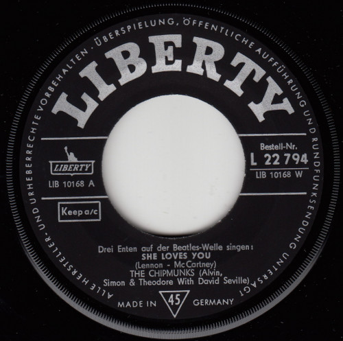 Matrix B: LIB 10 168 W Composer A: Lennon - McCartney Composer B: Lennon - McCarney Drei Enten auf der Beatles-Welle singen Chipmunks: Alvin, Simon & Theodore With David Seville |
