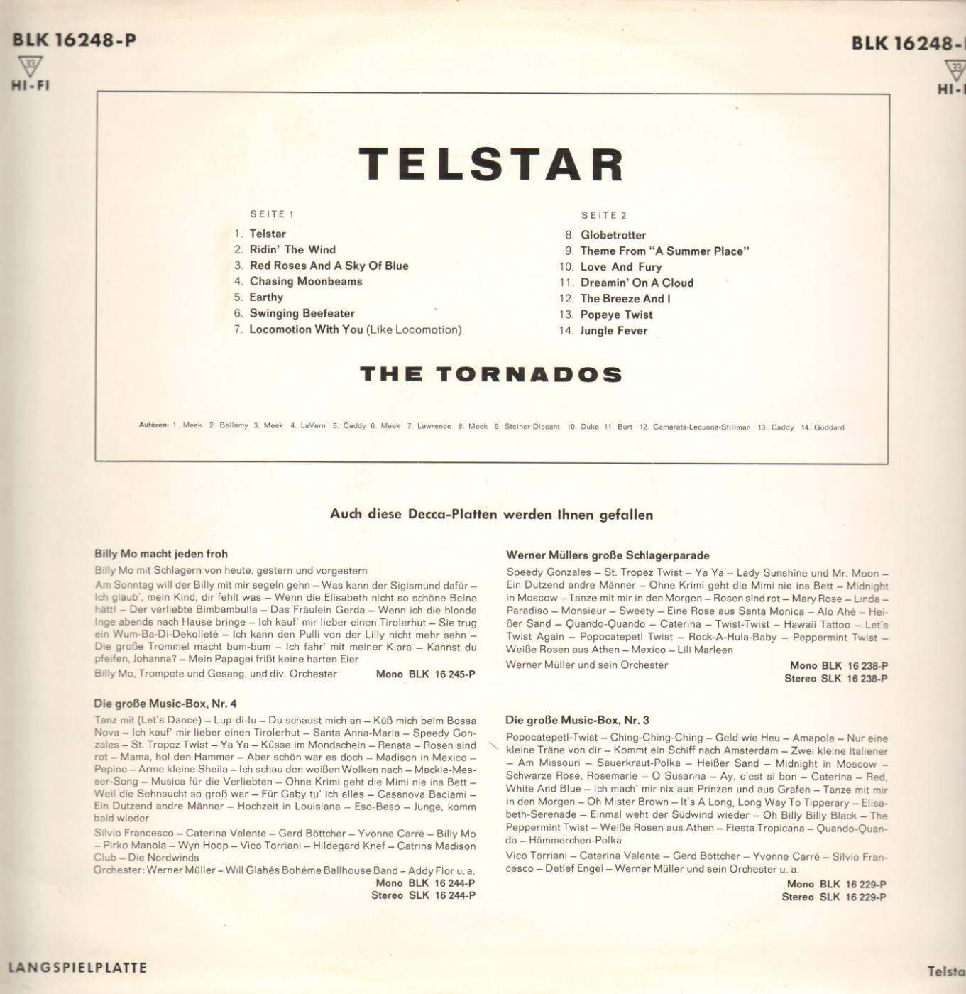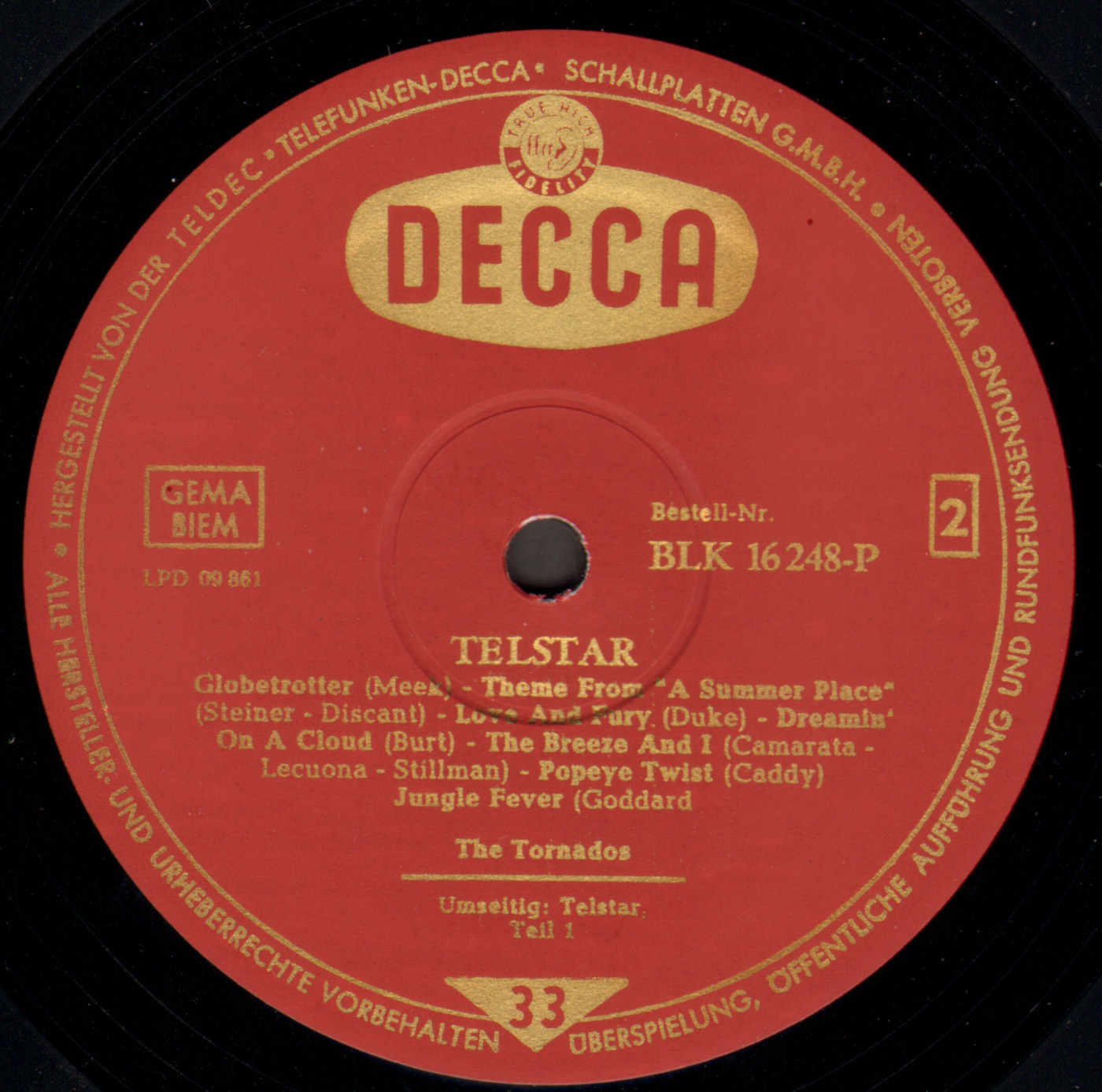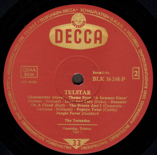Matrix No: LPD 09 860 + LPD 09 861 A-Side Telstar (Joe Meek) Ridin' The Wind (George Bellamy Red Roses An A Sky Of Blue (Joe Meek) Chasing Moonbeams (Roger LaVern) Earthy (Allan Caddy) Swinging Beefeater (Joe Meek) Locomotion With You (Like Locomotion) (Lawrence) B-Side: Globetrotter (Joe Meek) Theme Fron "A Summer Place" (Steiner - Discant) Love And Fury (Duke = Joe Meek) Dreamin' On A Cloud (Heinz Burt) The Breeze And I (Camarata - Lecuona - Stillman) Jungle Fever (Geoff Goddard) Original Decca Recording Location: Joe Meek R.G.M. Sounds, 304 Holoway Road, London Producer And Technician: Joe Meek Date: Insp (Rec) 1963 - Utg (Rel) 1963 Musicians: Alan Caddy (lg) George Bellamy (rg) Heinz Burt (bg) Roger LaVern (key) Clem Cattini (drms) |