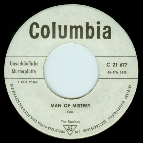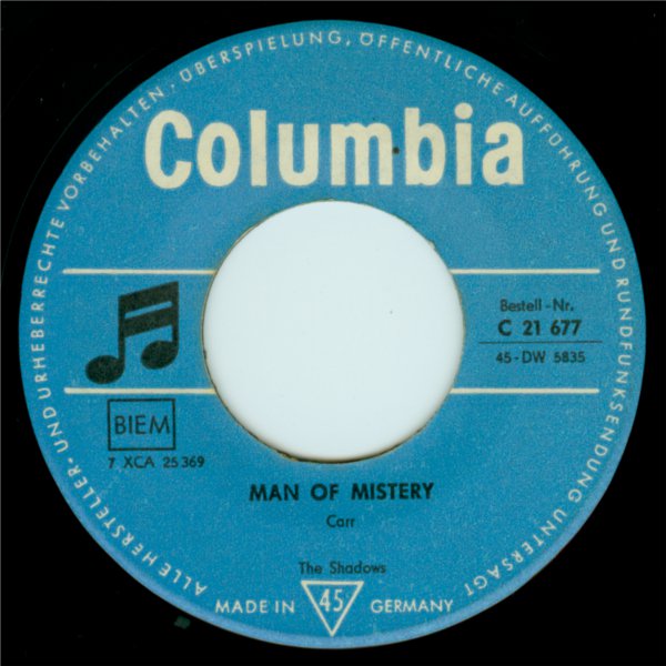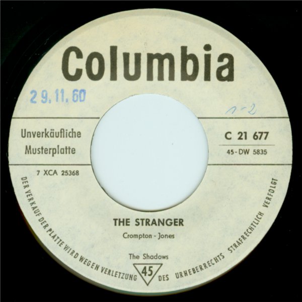 Length: 2:00 Matrix No: 7 XCA 25 369 Composer B: Bill Crompton - Morgan "Thunderclap" Jones Length: 2:40 Matrix No: 7 XCA 25 368 Location: Abbey Road Studios, London Recording Date: 1960-11-11 Musicians: Hank Marvin (lg) Bruce Welch (rg) Jet Harris (bg) Tony Meehan (drms) from: A pocket Guide to Shadow Music - Malcolm Campbell Veteran tunesmith Michael Carr, who penned MAN OF MYSTERY, had enjoyed a colourful life as a cowboy, actor and stuntman before turning his hand to songwriting. His previous successes included such classics as ‘We’re Going To Hang Out The Washing On The Siegfried Line’. This was The Shadows’ first piece from him: he also had a hand in their [28] KON-TIKI (1961), [56] THE BANDIT, [62] SOUTH OF THE BORDER (both 1962) and [106] THE MIRACLE (1964). He had written this particular melody as the theme for the Edgar Wallace Mysteries film series (see above, Introduction to 1960), which was memorably introduced by the lugubrious Edgar Lustgarten. Notable for being recorded at the then haven of respectability Abbey Road Studios in the midnight hours, The Shadows’ arrangement was taken at a tremendous lick with Hank playing throughout on heavily tremoloed treble strings with a powerful display of barely controlled frenzy in the middle-eight. There was also a fluffed note in the solo, which has been so slavishly copied by the group’s numerous imitators that nowadays Hank still has to play the ‘incorrect’ note to make the solo ‘correct’! THE STRANGER (working title: ‘Paleface’) is an elegant piece: it contrasted well, with a slower tempo in a broadly ‘Western’ vein, being recorded at around the same time as [17] THEME FROM SHANE/ [19] THEME FROM GIANT (see under 1961) etc. It was written by two musician friends from their days at the ‘Two Is’: pianist Jones and Crompton “were around the Soho area in the late fifties” (Trev Faull), ‘Thunderclap’ having recorded a few instrumentals (example: ‘Hurricane Boogie’!!) in 1956/57. It was the team’s second high-ranking chart success of the year, Craig Douglas having earlier netted a No.10 with their ‘Heart Of A Teenage Girl’. |