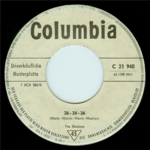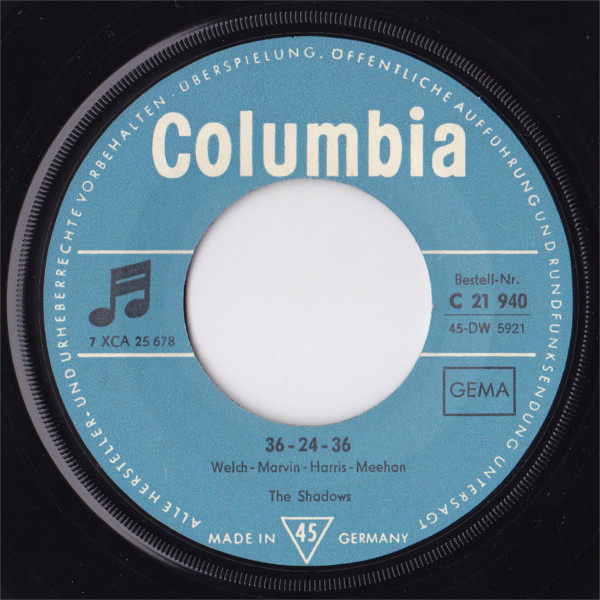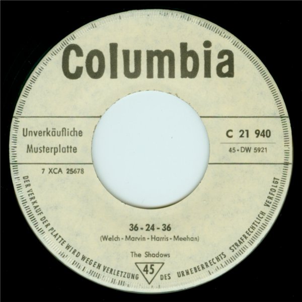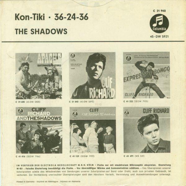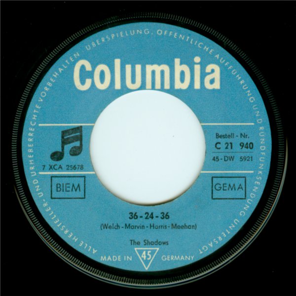 Length: 1:53 Matrix No: 7 XCA 25 510 Composer B: Bruce Welch - Hank Marvin - Jet Harris - Tony Meehan Length: 1:39 Matrix No: 7 XCA 25 678 Location: Abbey Road Studios, London Recording Date: 1961-01-27 + 1961-05-25 Musicians: Hank Marvin (lg) Bruce Welch (rg) Jet Harris (bg) Tony Meehan (drms) from: A pocket Guide to Shadow Music - Malcolm Campbell This track (Joe Brown played lead guitar on the demo submitted to the group) had been recorded before the previous A-side, [26] THE FRIGHTENED CITY, the latter released in April to tie in with the film (though there was no Shadows’ involvement in that). It was now KON-TIKI’s hour, and it fared better in chart terms. It came from the pen of veteran writer Michael Carr, proving that old ’uns could still write good ’uns. It was one of a number of tunes written in celebration of the tiny balsawood raft that transported Norwegian anthropologist and explorer Thor Heyerdahl on a 6,000 kilometre journey from Peru to Polynesia in 1947. The dramatic opening featured Tony Meehan on tympani with thunderous kettledrum overdubs, which burst out again in later passages. Jet played some almost funky bass figures against Hank and Bruce’s jangly guitar patterns offset against some chord progression sequences. A very rich, full sound. It is well known that Hank produced a mistake at 1:05 in the recording used for release. After the 1989 Polydor re-recordings Bruce commented “We only corrected a few of the nastier things like Hank’s duff note in KON-TIKI”. Some sources claim that the flipside title (reflecting the contemporary perception of the ideal female’s vital statistics; the working title was a rather dull ‘X-Y-Z’!) refers to a young secretary in Peter Gormley’s office. More recently Jet Harris has stated that the young lady concerned was a former girlfriend of his. Whoever the girl was, she inspired a jaunty track featuring Jet’s bass ostinato prominently. The number was professedly the group’s answer (an elegant one, without intrusive exclamations) to The Champs’ short and snappy ‘Tequila’, a USA No.1/ UK No.5 in 1958. In addition, an early favourite of the Shadows (played on Radio Luxembourg/BBC Radio, see Appendices 2/3) was CERVEZA. It was not an original number but it gave prominence to Jet’s bass playing. The advent of the similarly styled (but self-penned) [29] 36-24-36 a little while later illustrates that the group were quickly learning the financial tricks of the trade. Never a stage-favourite, it figured somewhat unexpectedly in The Final Tour of 2004/2005, with Hank improvising winningly from performance to performance. Forty or more years on, the melody is used by guitar teachers as an exacting exercise for would-be bassists! |