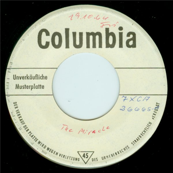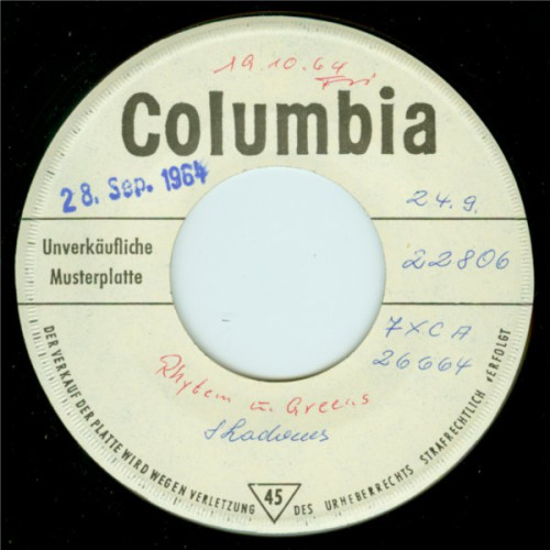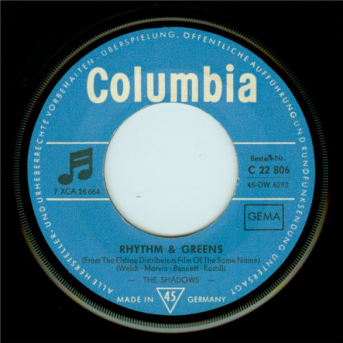 Length: Matrix No: 7 XCA 26 664 Composer B: Michael Carr - Norrie Paramor Length: Matrix No: 7 XCA 27 665 Location: Studio 02 at Abbey Road Studios, London Recording Date: 1964-07-12 + 1964-07-31 Musicians: Hank Marvin (lg) Bruce Welch (rg) John Rostill (bg) Brian Bennett (drms) from: A pocket Guide to Shadow Music - Malcolm Campbell The title track of this short support film (see next main entry) was described by Hank as “A raving great send-up of the R ’n’ B boom”. It was raw, gutsy playing from the group complete with humorous sound effects and crazy scat yelling: see further Introduction to 1964 above. The group had hoped that it might have fared better than its chart position of No.22 (their first disc not to make the Top 20 since APACHE). But Hank added a disclaimer: “Let’s face it, there wasn’t a great deal of melody there.” The working title of RHYTHM AND GREENS has been variously reported: the version, as entered on EMI Recording Instruction sheets, was ‘A Look At Rubbish’, whereas band members recall ‘A Load Of Rubbish’, the latter certainly sounding the more plausible; if it is correct, someone at the sessions must have misheard and made an erroneous entry (there is no shortage of parallels for that). George Geddes however acutely suggests a different path: he recalls the 60s cinema fillers, around nine minutes long, ‘Look At Life’, narrated by Tim Turner; subjects were many and various: there was a feature for example on Burns guitars, and another (figuring in the recent DVD release of the ‘Expresso Bongo’ [Collector’s Edition] DVD) about coffee shops and cafes that contained a minute of Brian Bennett and Brian Locking with The Krew Kats. THE MIRACLE (originally destined for the cinema??) was one of those stately opuses, which the group could play supremely well. Their own performance was augmented by The Norrie Paramor Strings and a harpist. Had this beautifully crafted fusion of beat-group and orchestra surfaced a year or two earlier, it would surely have been a mega-hit. Over a long career Michael Carr (see under November 1960, [14] MAN OF MYSTERY) collaborated with a range of composers — recently with Norrie Paramor (and Bunny Lewis) for the song ‘Another You’ featured in the 1963 B-movie ‘Murder Can Be Deadly’. |
